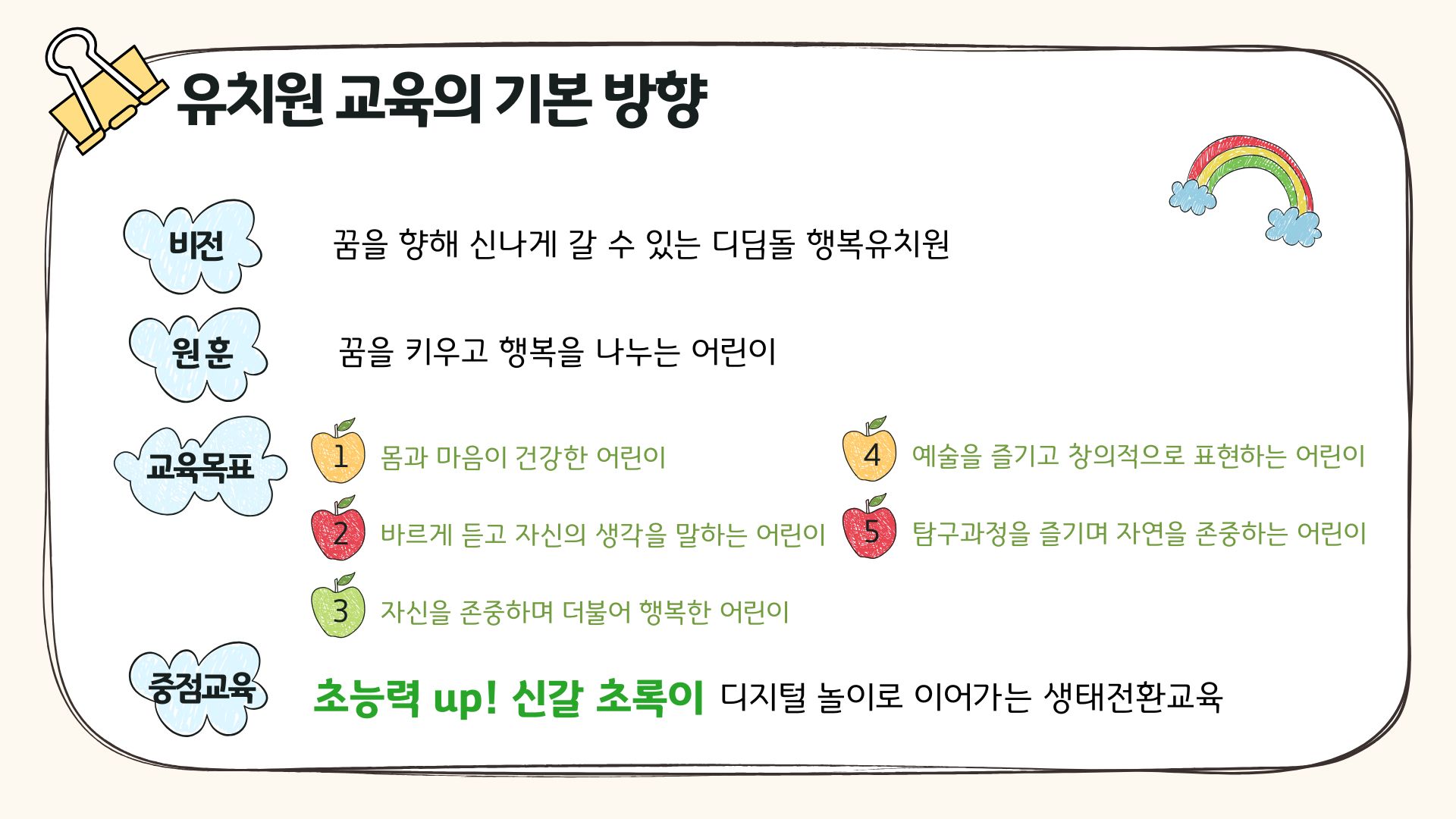 우리 유치원은 “꿈을 키우고 행복을 나누는 어린이”라는 원훈 아래몸과 마음이 건강하고 창의적으로 탐구하고 표현하는 어린이로 길러 행복한 유아, 헌신하는 교사, 신뢰 받는 유치원을 만들어 가는데 최선을 다하겠습니다.